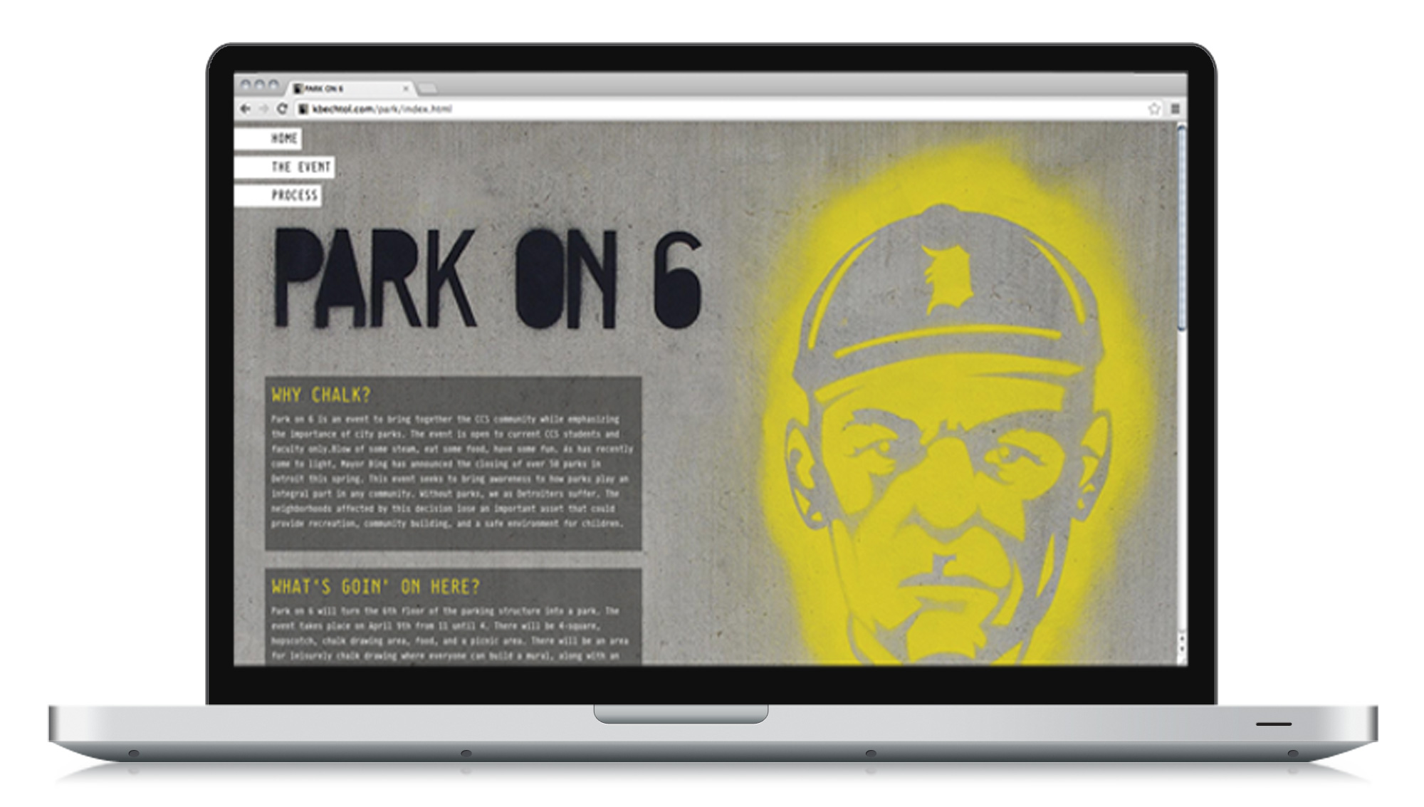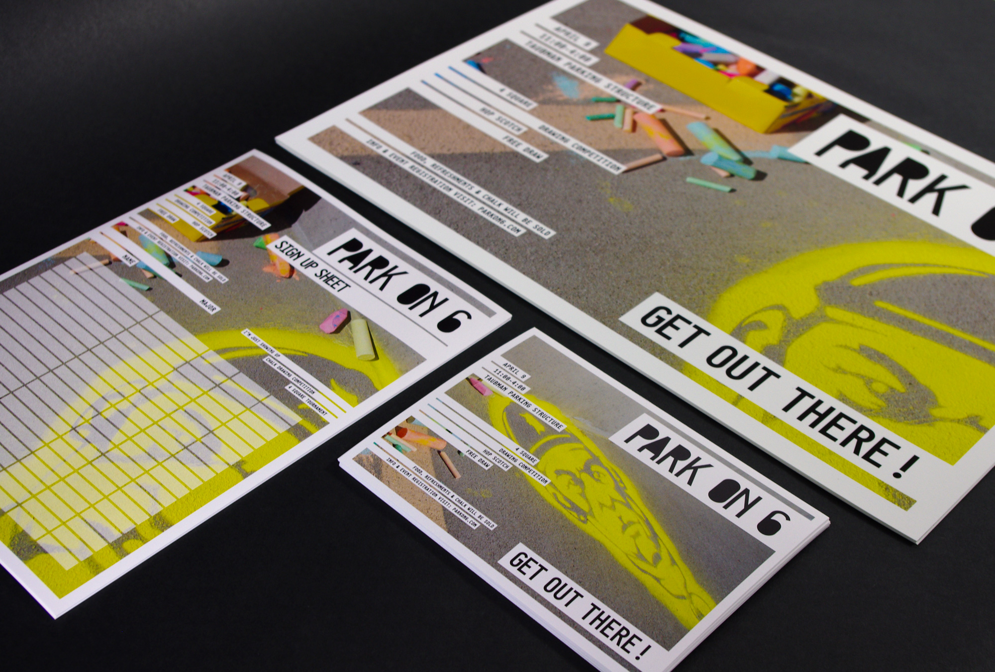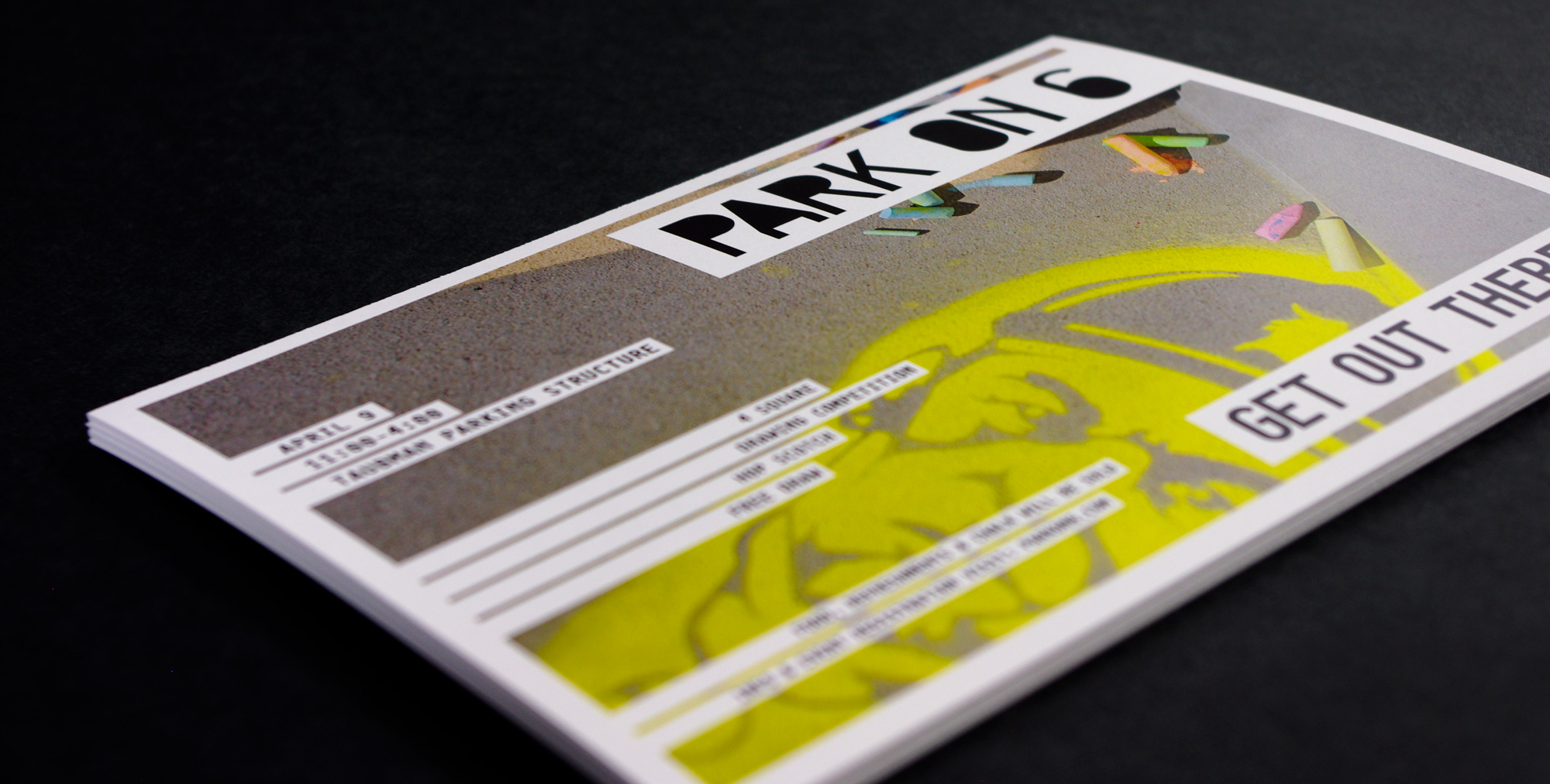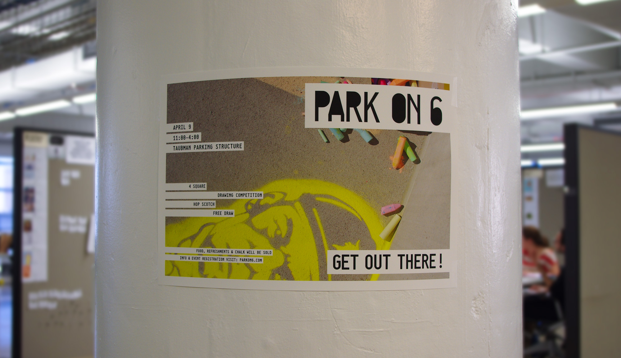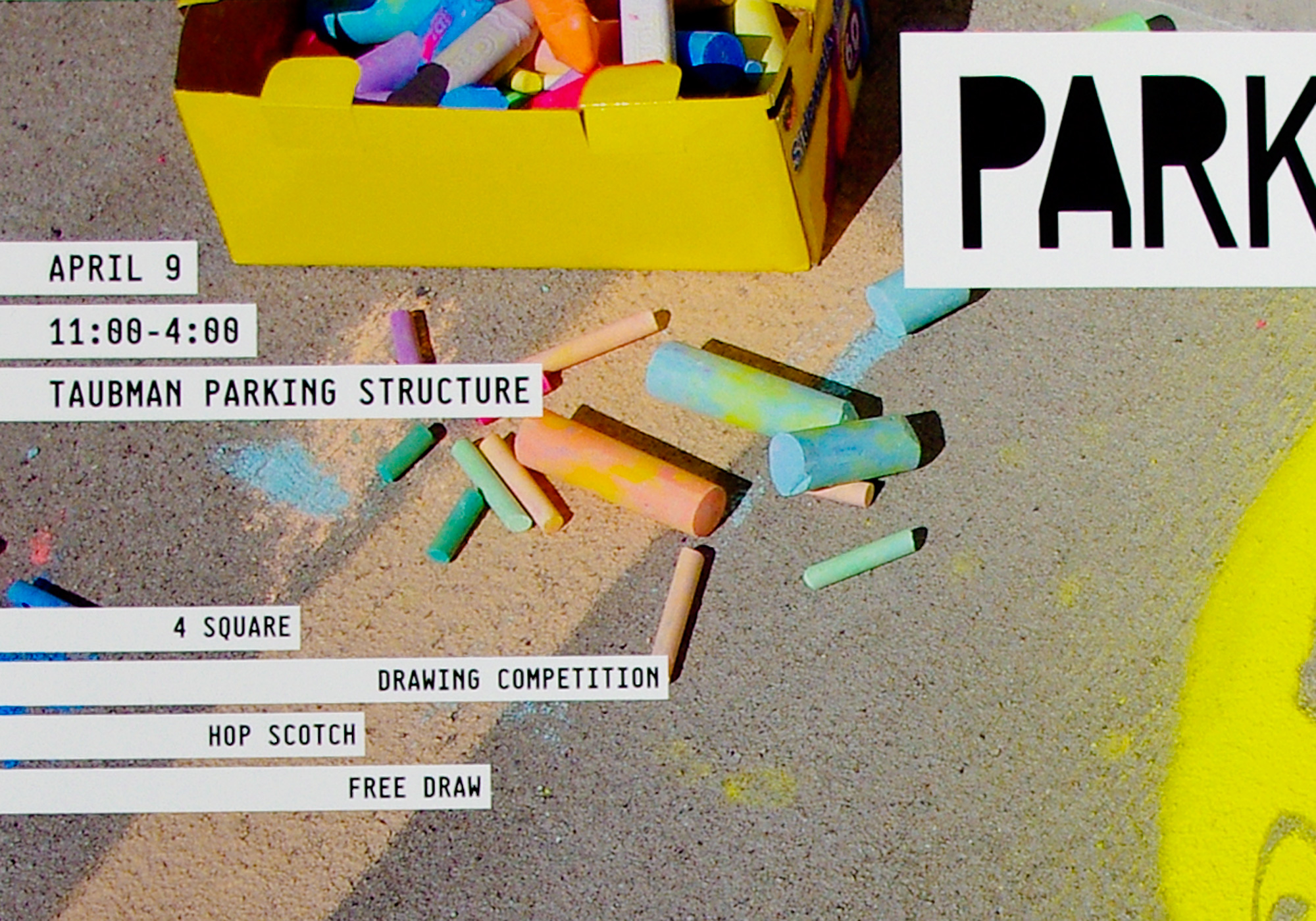 Park on 6 was an event for College for Creative Studies students and faculty to emphasize the importance of parks within a community and as an effort to raise money for The Mower Gang; a group who helps maintain neglected Detroit parks. The event consisted of park-like games revolving around the use of sidewalk chalk and took place on the top of the parking structure at CCS.